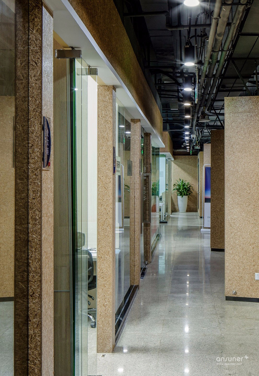 主要材料:木饰面、瓷砖、黑钛钢、仿真绿植等