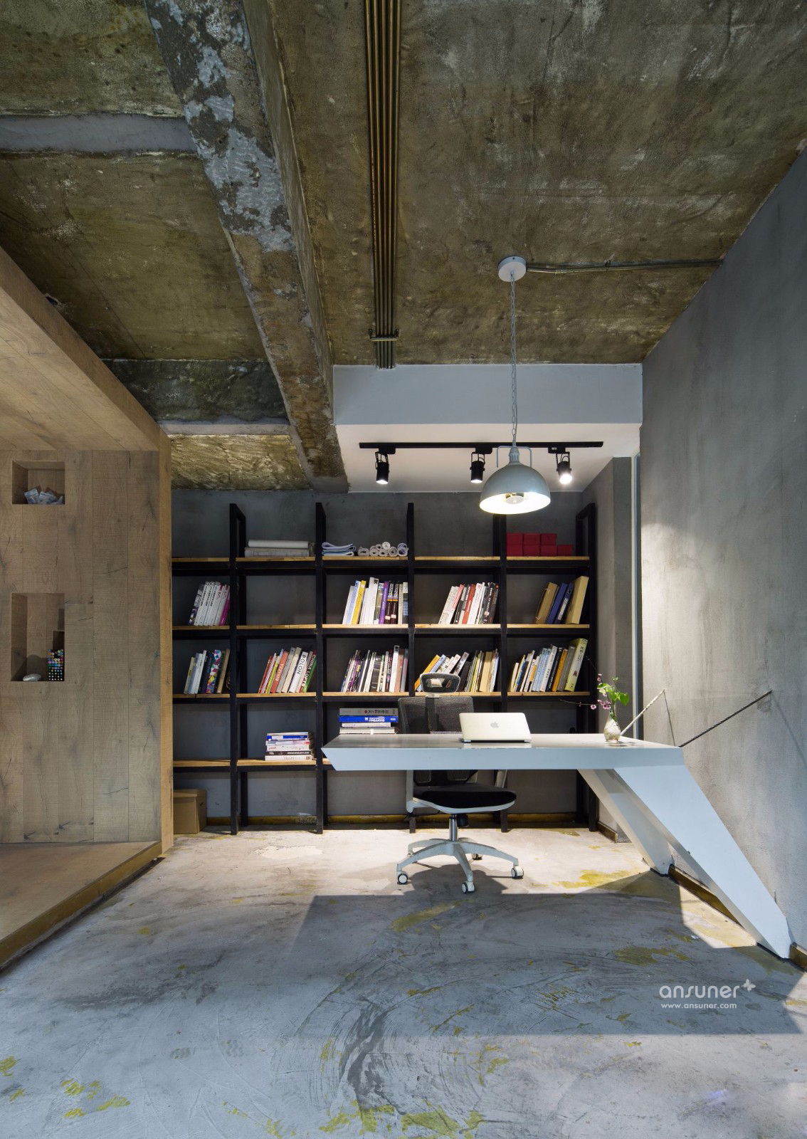 办公空间一共分为上下两层,上层是日常的办公空间,所有墙面的色泽深浅变化与印压痕迹,打造出新旧交融的后现代风格空间,独具粗犷的美感,。办公桌椅及办公用具皆采用白色,与空间色调搭配既和谐又现代。场地对角线处隔出一个玻璃空间和木框空间,采用半隔断的方式使空间的划分自由度很高,平常可用于简单的会议和会客,通透的玻璃天花板让采光变的更通透,再配以随时开合的玄色卷帘,显得极为体贴温馨。