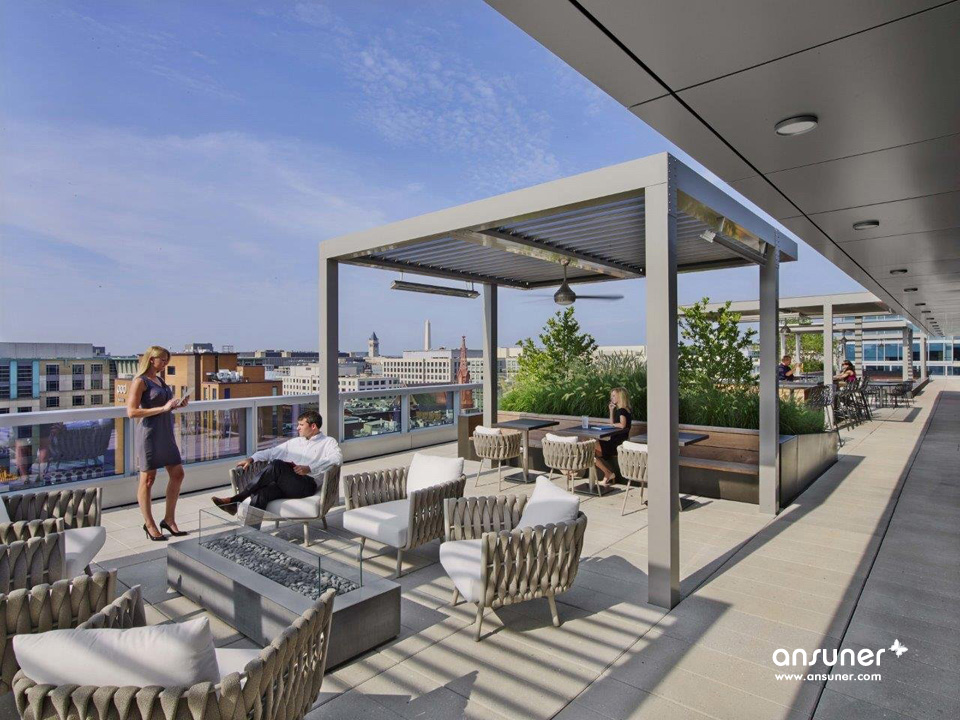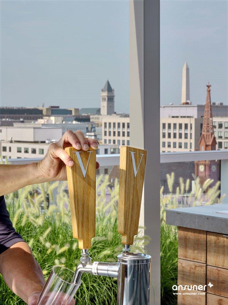新总部还有一处拥有开阔视野的屋顶露台。除了休闲、洽谈,这里还特别设计了一处游戏场地:意大利式室外地滚球,作为Venable的传统保留项目,这种兼具友好与竞争性的团队运动非常容易拉近彼此间的距离、增强公司的凝聚力、培养团队精神。