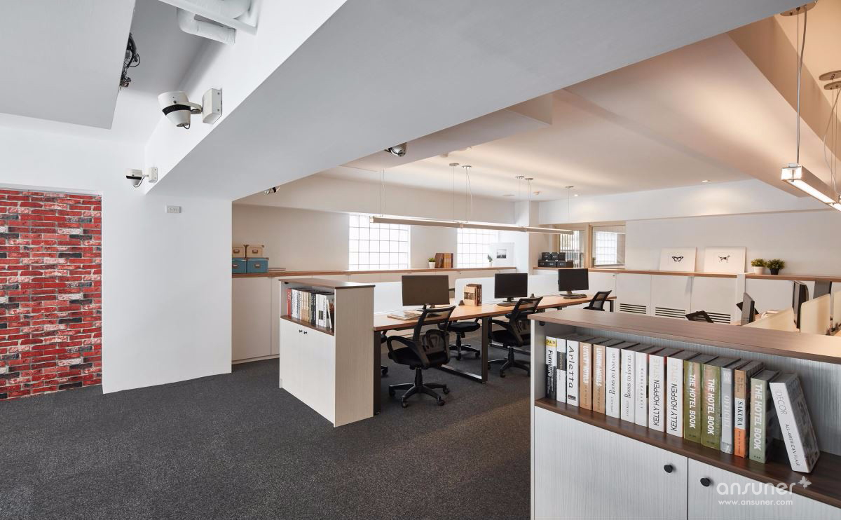 善用挑高空间打造大面积落地窗,并以大量镂空铁件彰显利落气息,设计师更巧妙使用仿红砖壁纸、仿清水模漆以及木纹塑胶地砖,大幅降低装修预算,完成工业风格营造。以一道吧台巧妙分隔接待区与后方会议空间,兼具隐私与置物功用,更利用结构墙下方畸零空间规划柜体,拓增收纳机能。二楼以办公空间为主,以开放设计与纯白色调一扫传统 OA 办公的制式呆版,将有着通风孔设计的无印风置物柜贴齐壁面,让行进动线更加流畅,小型会议室的玻璃隔间更抹除狭小阴暗的可能性。